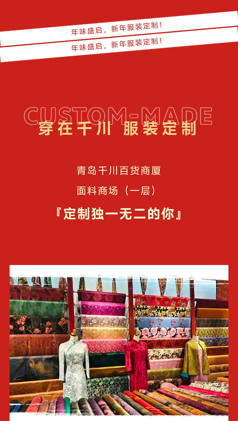 新闻动态,青岛旗袍定制-青岛旗袍上门量体定做-千川百货,青岛千川百货是一家经营面料、服装、靴鞋、毛衫、床上用品、服装定制、旗袍定做、中式服装定做的综合性商厦。千川百货结合互联网 O2O模式在青岛市区内提供旗袍上门预约定制服务,在同行业中处于领先地位。